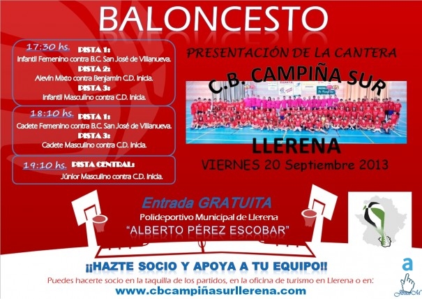 El próximo viernes 20 de septiembre, a partir de las 17:30 hs. en el Pabellón Municipal de Llerena, tendrá lugar la puesta de largo de la cantera del C.B. Campiña Sur de Llerena. Al igual que la temporada pasada, los equipos que participarán en la presentación son dos clubes que funcionan con la misma filosofía del "campiña". Estos son el C.D. Inicia (amigos y colaboradores del club llerenense) y el C.B.F. San José de Villanueva (referente del baloncesto femenino extremeño), ambos de Villanueva de la Serena.