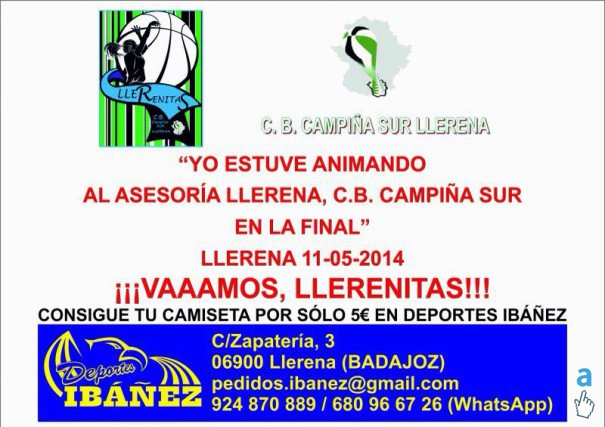 El domingo 11 de mayo a las 11:00 hs., en el "Alberto Pérez", el plato fuerte para los llerenenses. La final sénior femenina entre ASESORÍA LLERENA C.B. CAMPIÑA SUR - A.D.21 DON BENITO. Esperamos el apoyo de todos los llerenenses y que se "llenen" las gradas del pabellón. Animando, siempre de forma deportiva como es habitual, y llevando en volandas a nuestras "llerenitas". Para ello, vamos a dar colorido a las gradas, con camisetas de apoyo al equipo. En Deportes Ibáñez, por tan solo 5 €, puedes hacerte con la camiseta que te identificará como aficionada o aficionado del C.B. Campiña Sur de Llerena. En resumen, cita importantísima de nuestras chicas, en la que se espera una gran respuesta y apoyo de todos los habitantes de Llerena.