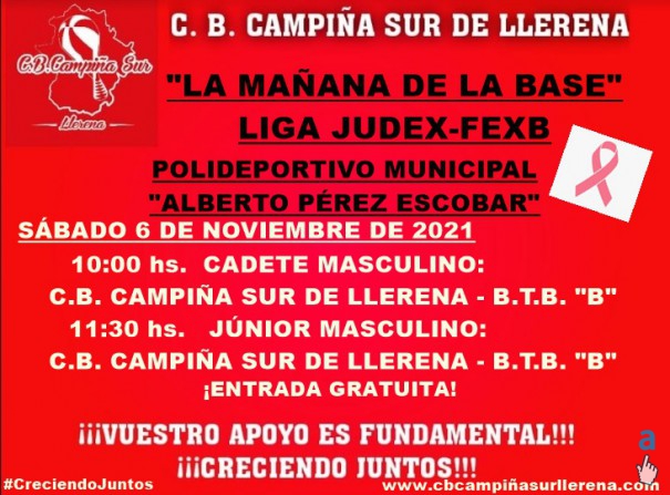 El próximo sábado 6 de noviembre, juegan nuestros equipos: los de la BASE que compiten, y el SÉNIOR MASCULINO, que juega la mañana del domingo en la pista del C.B. Xerixia. Los equipos infantil y júnior femenino, jugarán fuera de casa, en las pistas C.B. Sajra y del P.M.D. Azuaga, respectivamente. Tendremos "LA MAÑANA DE LA BASE" en el "ALBERTO PÉREZ", con nuestros equipos masculinos.. Esperamos el apoyo de todos los familiares y de la afición, con deportividad (como siempre) y cumpliendo con las medidas de seguridad COVID-19.