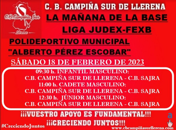 El próximo fin de semana, solamente juegan nuestros equipos masculinos de la BASE que compiten en JUDEX-FEXB. Los equipos MASCULINOS INFANTIL, CADETE y JÚNIOR jugarán "LA MAÑANA DE LA BASE" en el Pabellón Municipal de Llerena "ALBERTO PÉREZ". Esperamos, unas gradas repletas de aficionados y, como siempre, animando con DEPORTIVIDAD.