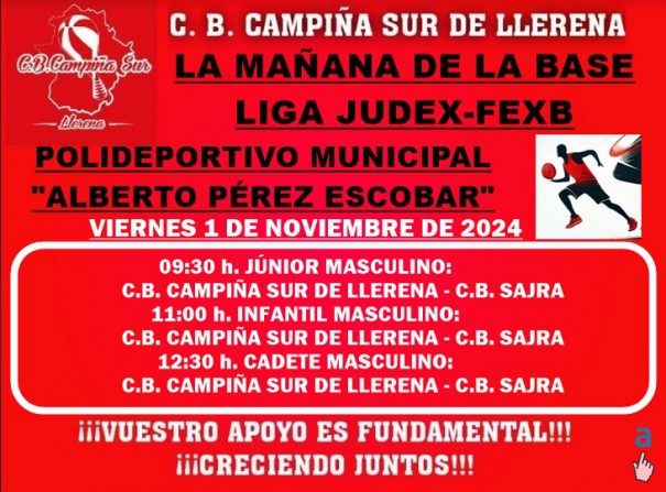 El próximo fin de semana, tercera jornada para nuestros equipos de la BASE que compiten, en JUDEX-FEXB. Nuestros equipos FEMENINOS INFANTIL, CADETE y JÚNIOR FEMENINO, viajarán. Jugarán la mañana del viernes en la pista del E.D.M. VILLAFRANCA, las INFANTILES y CADETES. Harán lo propio las JUNIORS la mañana del domingo en la pista de C.B. SAJRA. Nuestros equipos MASCULINOS INFANTIL, CADETE y JÚNIOR, juegan la mañana del VIERNES 1 DE NOVIEMBRE DE 2024 en el "ALBERTO PÉREZ".