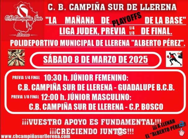 PREVIA A 1/8 DE FINAL jugarán nuestro INFANTIL FEMENINO y nuestro JÚNIOR MASCULINO. PREVIA 1/4 DE FINAL jugará nuestro JÚNIOR FEMENINO. Los partidos se jugarán la mañana del sábado 8 de marzo de 2025. Estas eliminatorias se juegan a partido único, en la pista del mejor clasificado en la FASE REGULAR. El INFANTIL FEMENINO juega en la pista del SPORTMAKING CÁCERES, el sábado a las 12:00 h. en el Pabellón de la Universidad Laboral de Cáceres. Los equipos JÚNIOR FEMENINO y JÚNIOR MASCULINO, jugarán el sábado "LAS MAÑANAS DE PLAYOFFS DE LA BASE" en el Polideportivo Municipal de Llerena "ALBERTO PÉREZ". ¡¡¡A LLENAR EL PABELLÓN!!! Debe ser la fiesta del baloncesto, animando al máximo, SIEMPRE DESDE EL RESPETO Y LA DEPORTIVIDAD.